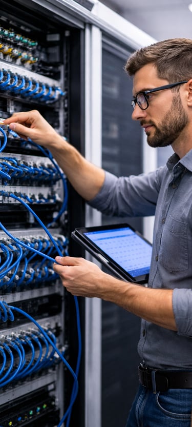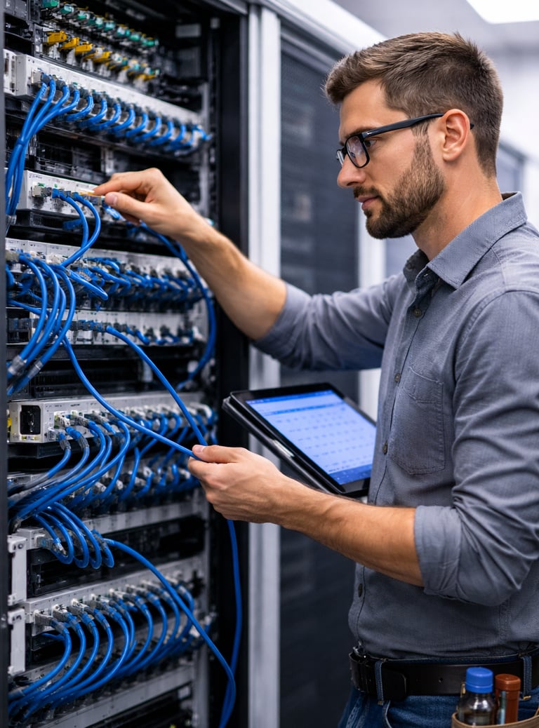 Realizamos estruturação de cabeamento de rede, organização de racks, certificação de pontos, instalação e configuração de equipamentos como roteadores, switches e access points, além de otimização e monitoramento da rede.